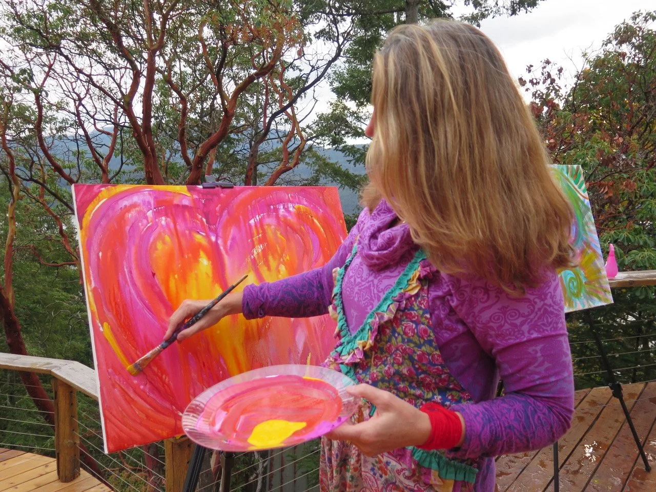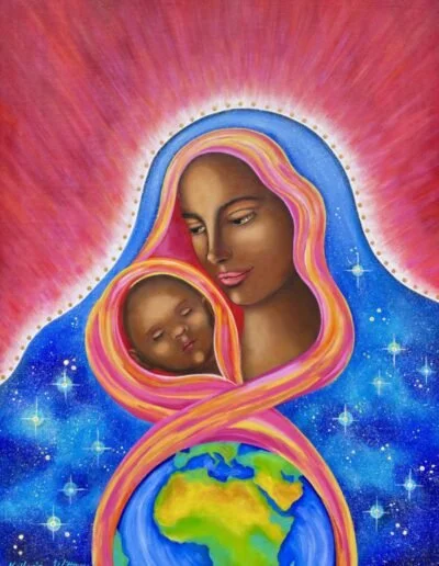 My vibrant, multi-layered paintings are soul-journeys and conversations with the Divine. They reflect my joyful heart, deep gratitude for life, and awe for the natural world. They honor my love of mysticism, my fascination with symbolism, and my reverence for sacred geometry. Perhaps, most of all, they embody my devotion to the Divine, my love of the Goddess, and my commitment to celebrating the Sacred Feminine in us all. For me, these creative journeys produce powerful healing, life-saving transformation, and liberated joy. They awaken me to life’s deep holiness. Sharing these gifts with the world through my paintings and my teachings is my sacred soul-calling. I am forever grateful and profoundly honored to walk this path.